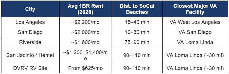 In Hemet and San Jacinto, average one-bedroom rents hover between $1,200 and $1,500, with significant inventory below that threshold. For RV park residents, the math gets even more favorable: Diamond Valley RV Park’s long-term rates start at $625/month — placing total monthly housing costs (site fee plus metered electric) in the $700–$730 range. That’s a figure that simply doesn’t exist in Los Angeles, San Diego, or coastal Orange County.