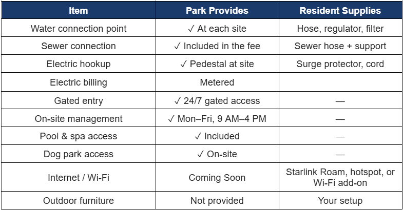 Your first month at an RV park is the steepest part of the learning curve — and it’s genuinely not that steep. Most residents describe the transition as easier than they expected, especially once the first week’s logistics are behind them.