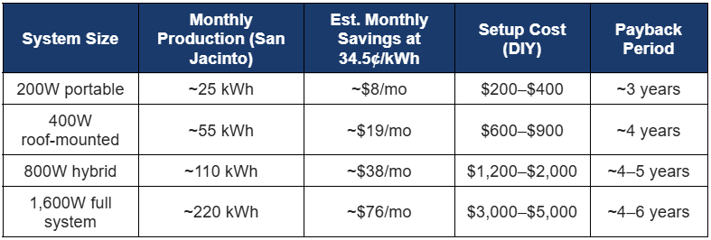 Note: Production estimates based on San Jacinto’s average of 5.5 peak sun hours per day. Actual output varies with season, shading, and panel angle.