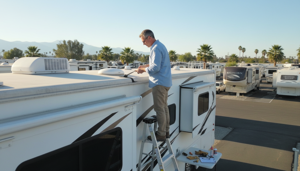 Stationary living changes what wears first. When an RV is parked in one position for months, UV exposure and environmental factors differ significantly from a rig in regular travel. Tires develop flat spots from stationary loading. Roof seals that would be “good enough” for one trip per year can fail under sustained UV exposure in Southern California’s high-UV climate.