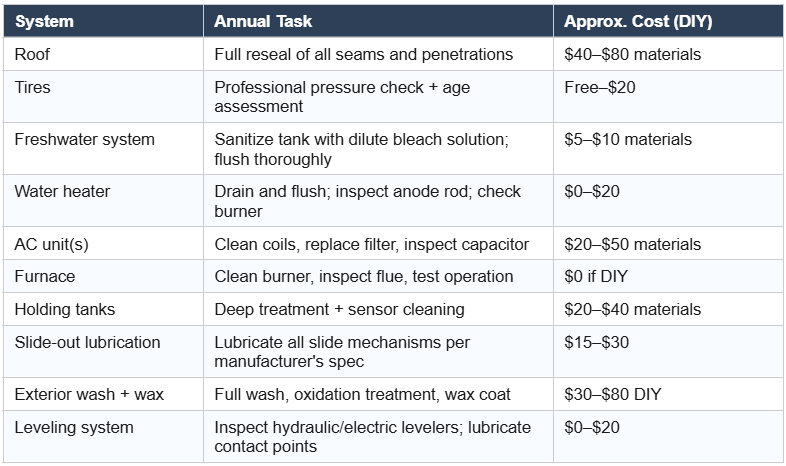 Full-time and long-term RV living is genuinely comfortable and cost-effective — but only when the rig is maintained with the same regularity that a homeowner applies to a house. A $40 tube of lap sealant applied on a Saturday afternoon is a very different conversation than a $2,000 delaminated wall from water intrusion that sat unaddressed for a season.