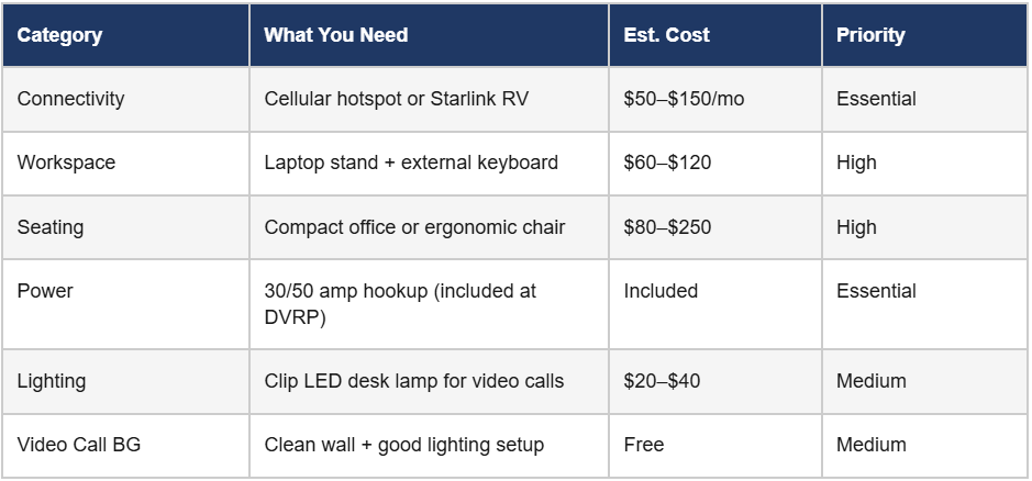 The biggest practical concern for most remote workers considering RV living is workspace. Here’s what works: